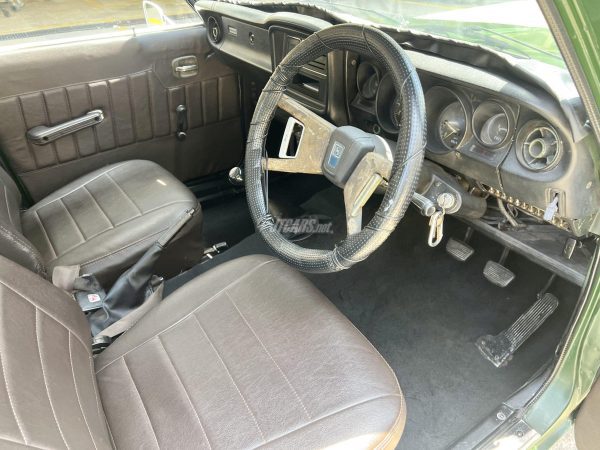 The DX trim level came equipped with enhanced chrome exterior detailing, full instrumentation, and upgraded interior upholstery. The original brown leather interior remains intact, preserving its authentic 1970s atmosphere.