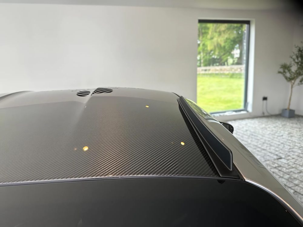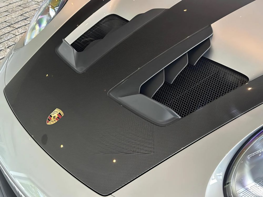 - Front lid, roof, window triangle and exterior mirrors upper shell in visible carbon (high-gloss), rear wing (movable part) in visible carbon (high-gloss) and with "PORSCHE" lettering on the underside.