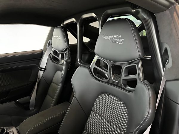 - Bolted rear roll cage in visible carbon (satin finish), door pull handle in visible carbon (satin finish), PDK gearshift paddles made of magnesium with rear milling and magnetic technology, upper part of gearshift panel covered with Race-Tex black, badge with Weissach package logo on passenger side, headrests with embroidered Weissach package logo and enclosed 6-point seat belt for driver and passenger side in black.
